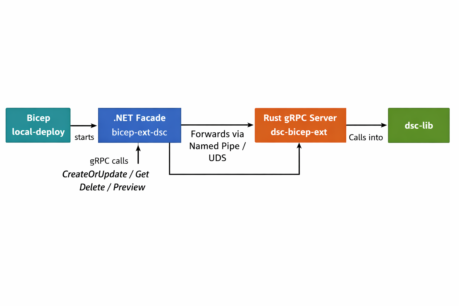 Its second part sits in a gRPC proxy. Whenever bicep local-deploy runs, it starts a .NET facade binary (bicep-ext-dsc). That facade hosts a hosted gRPC service, immediately spawning the real Rust gRPC server. This gRPC server is built inside the DSC repository. To better illustrate it, check out the following image: