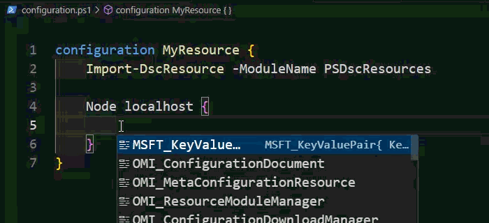The PowerShell DSC v1.1 and v2.0 IntelliSense feature has been amazing to this day. You would fire up VS Code (or PowerShell ISE), start declaring the Configuration keyword, import the module containing DSC resources, and declare your resource.
