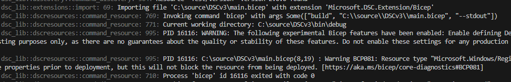 - The generated Bicep files don't yet compile to the final DSC configuration documents format (you've to transform the outputted JSON file from