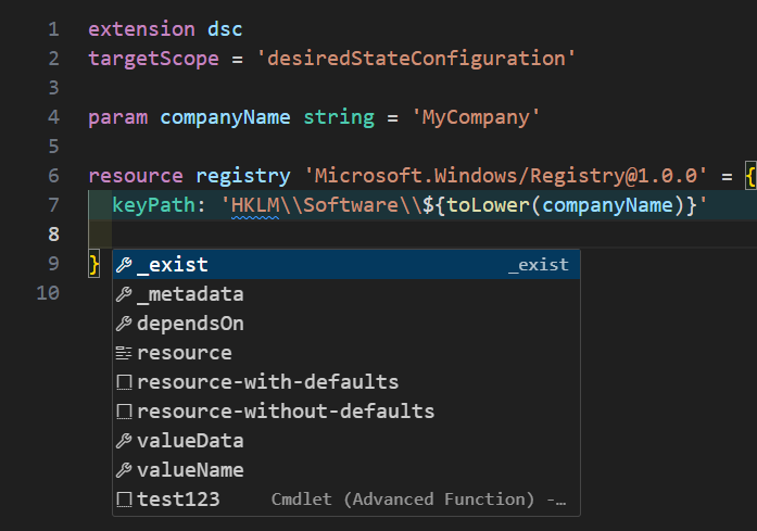 The bicep-types-dsc project illustrates how worlds collide together. It bridges the gap of IntelliSense. By leveraging Bicep's type system and extensibility, you can restore the authoring experience developers expect while benefiting from new capabilities through ARM functions that were never available in PowerShell DSC>