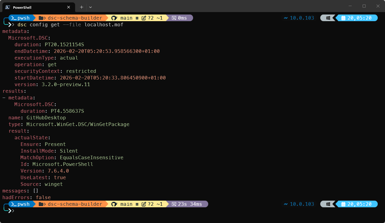 As you can see, it clearly maps all the resource definitions (and properties) directly to Microsoft's DSC format. It even includes the stable $schema element in there. You can pick this up into a variable or output it to a file and give it to dsc config <operation> command.