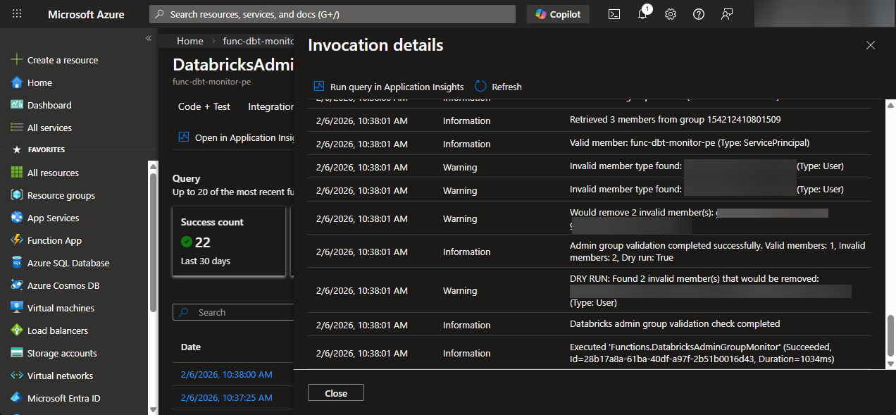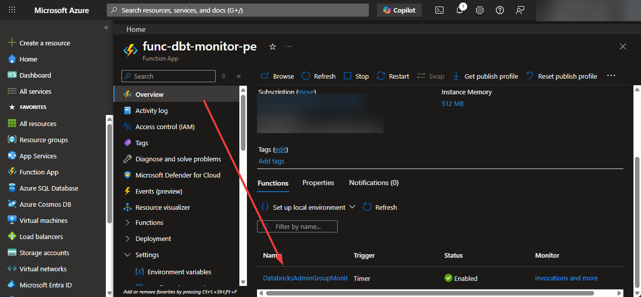 --build-remote trueIt's important to know the --build-remote switch flag. It tells Azure to build your Python dependencies on the server side. This avoids issues with platform-specific packages. After a couple of minutes, navigate to the Azure Portal and locate your Function App -> DatabricksAdminGroupMonitor: