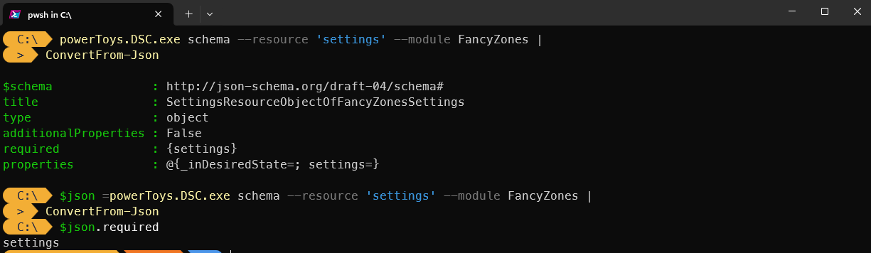See, Microsoft DSC expects a strong contract. That contract states the expected input and outputs. To illustrate this example, you can run the following command to list out the schema for the FancyZones module resource: