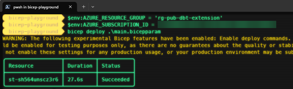 The readEnvVar is a new function to read environment variables for the bicep deploy command. If these values are not set while deploying, the CLI will throw an error. Let's test it out by running the command.
